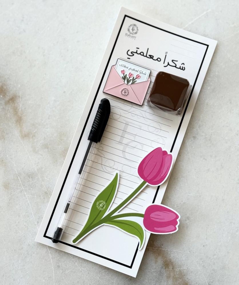 بطاقة يوم المعلم ( شوكولاتة + بروش+ قلم )
