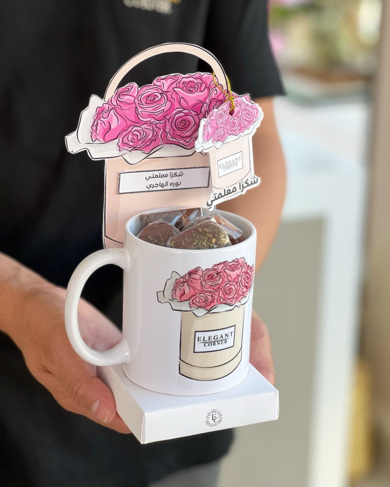 الهدية تشمل ( الكوب + البطاقة + تغليف سولفان + كيسة )